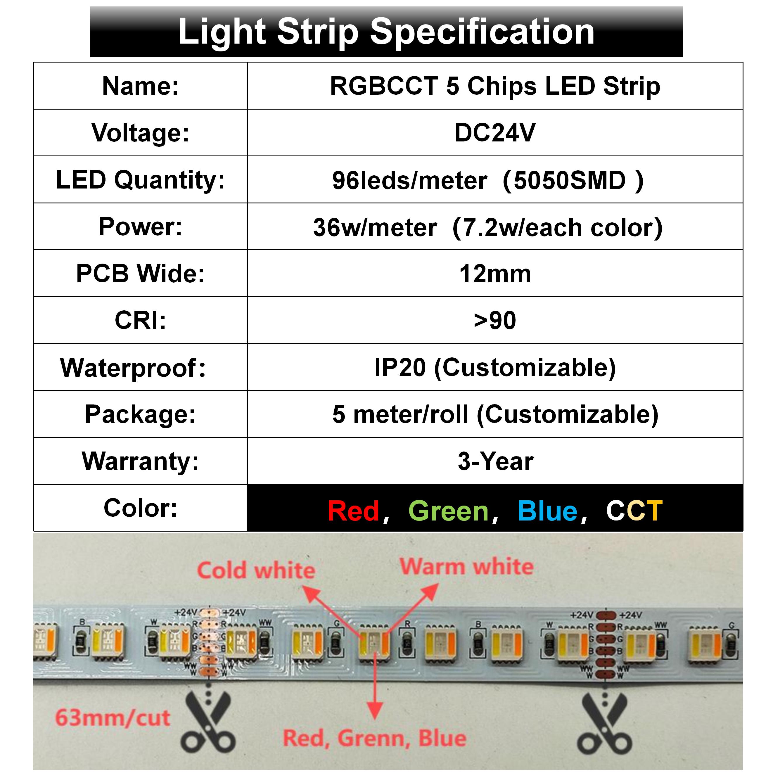 RGBCCT жарықдиодты жолақтар бес тәуелсіз жарықдиодты чиптер (қызыл, жасыл, көк, жылы ақ, жылы ақ, жылы ақ, жылы ақ және салқын ақ), олар миллиондаған түстер мен толық спектрлі ақ жарық температураларын, шамамен 2700K (жылы ақ), 6500K (салқын ақ).