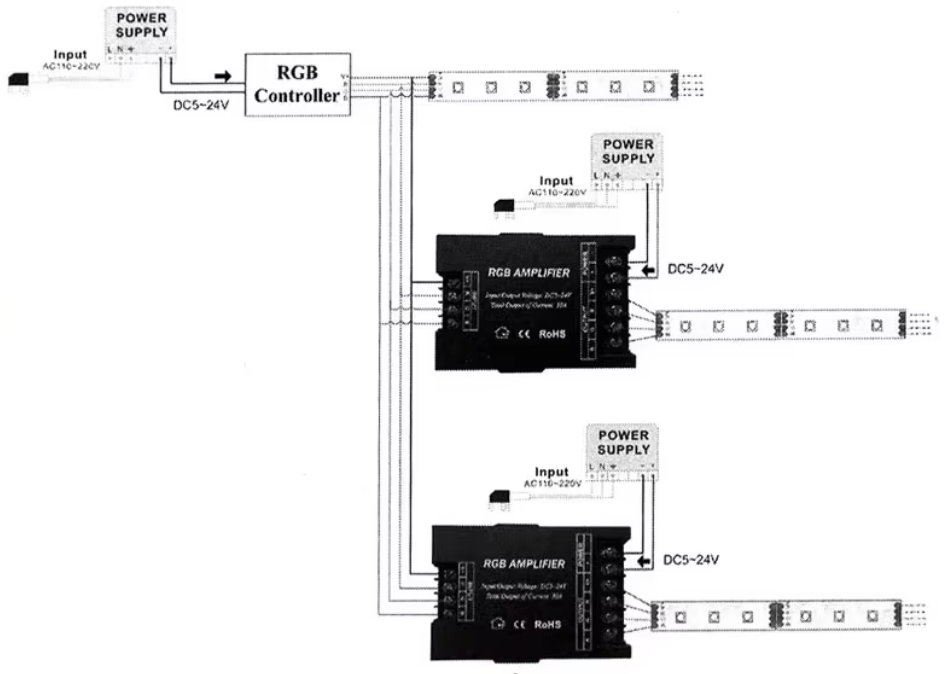 Алдымен күшейткіштің кірісін контроллерге жалғаңыз, содан кейін күшейткіштің шығыс ұшын жолақ шамына қосыңыз.
