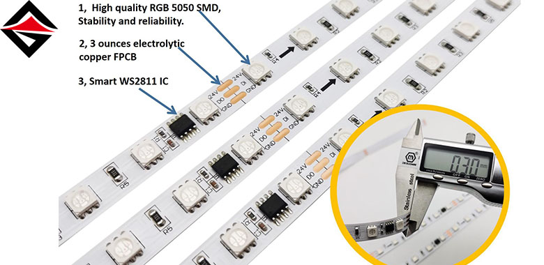 Әдетте ағынды жарық жолағы үш негізгі түстердің жарық диоды бар, қызыл, жасыл және көк, түрлі түстерді араластыра алады. Жоғары деңгейлі модельдерді қолдайды Толық түсті тәуелсіз мекен-жайы, әр жарық диоды RGB мәнін бөлек орнатып, шамамен 16 миллион түстерді көрсете алады.